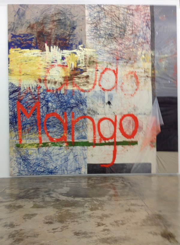 On the ground floor mammoth gallery are large, beautiful paintings by Oscar Murillo, who is the Rubell’s first ever-artist-in-residence. The five paintings shown were created onsite consisting of debris, dirt, dust, and items found within the studio. Words are written on the paintings like “yoga” and “chorizo,” which reference the social implications of these nouns.